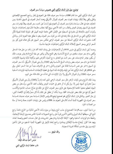 وقال البنك في بيانه بأن سياسية التعويم ليست جديدة وانما تصحيح لسياسية التعويم التي اتخذها البنك المركزي اليمني منذ العام 1996م في اطار برنامج التصحيح الإقتصادي والمالي.