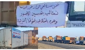 دشن سائقو قواطر وشاحنات النقل الثقيل في مديرية طور الباحة بمحافظة لحج، أول خطوات الإضراب الشامل عن ن ...